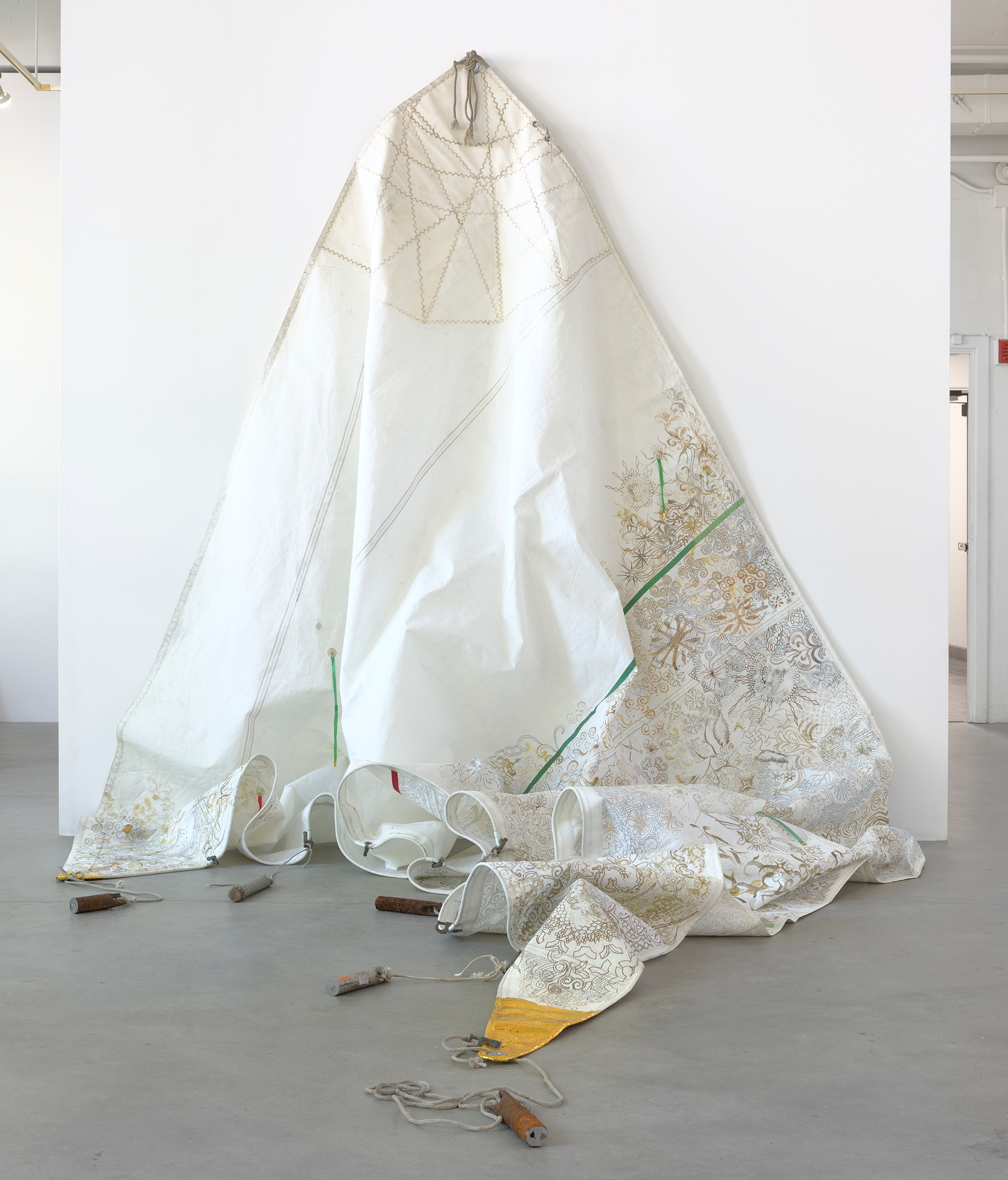 For Untold Passage Mary Ann Peters created a new piece in her impossible monuments series that commemorate the histories that go unmemorialized, events “that deserve reverence but by virtue of its incidental nature would never be elevated to the status of a monument.” In impossible monument (telltale) Peters looks at the experiences of immigrants and refugees, using a sail as a canvas to point to the experiences of individuals forced to flee their homes.